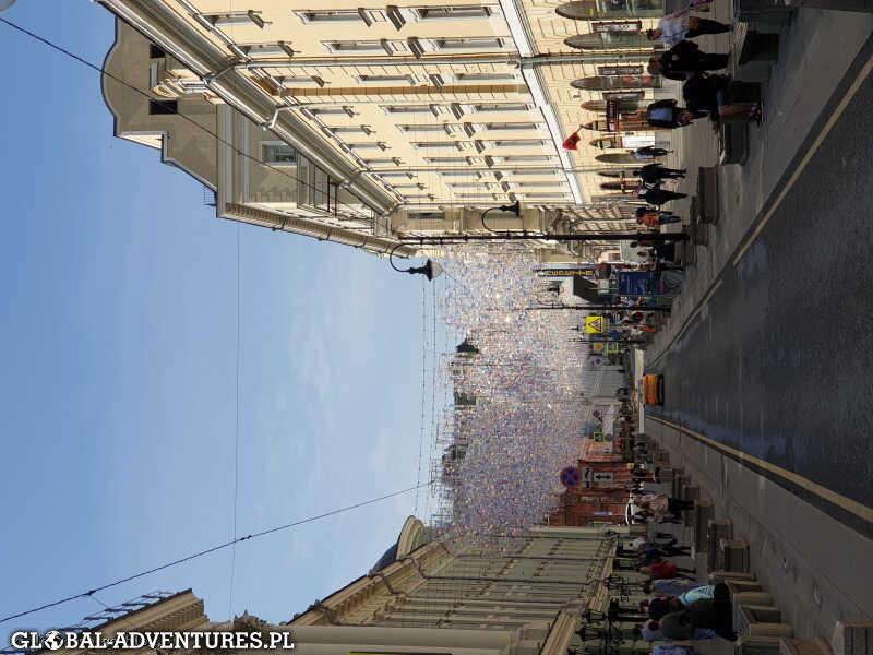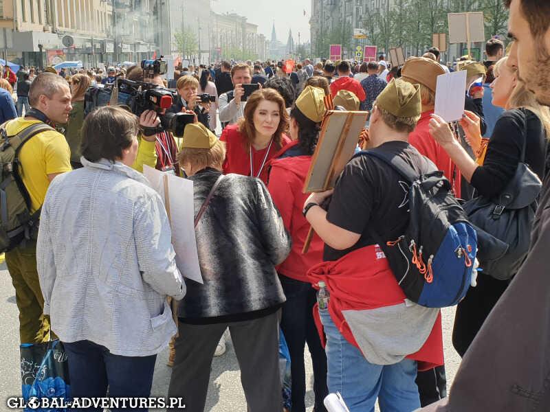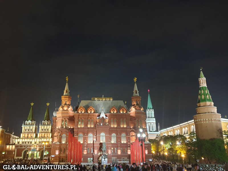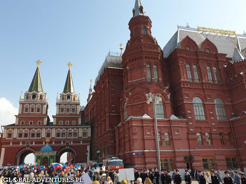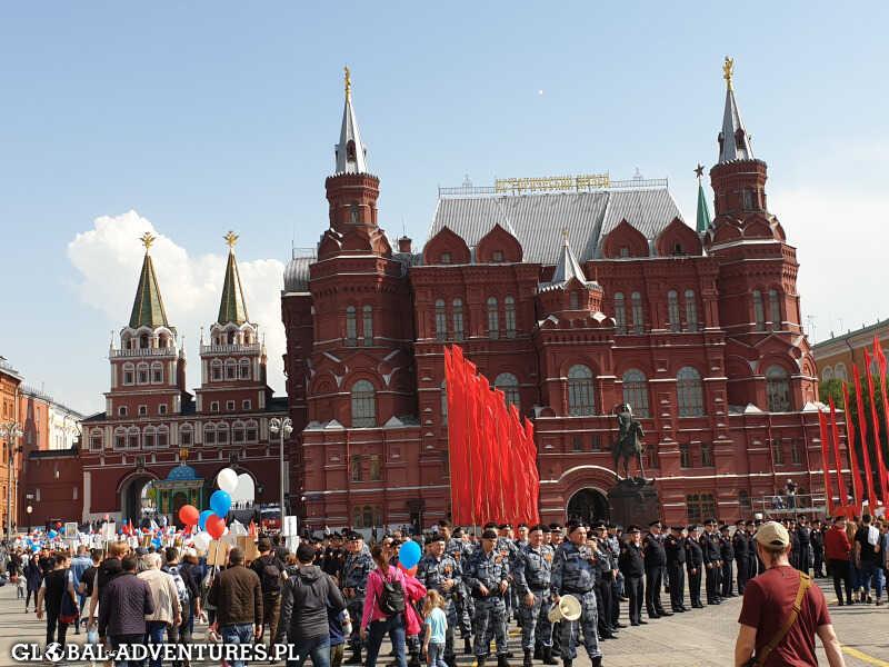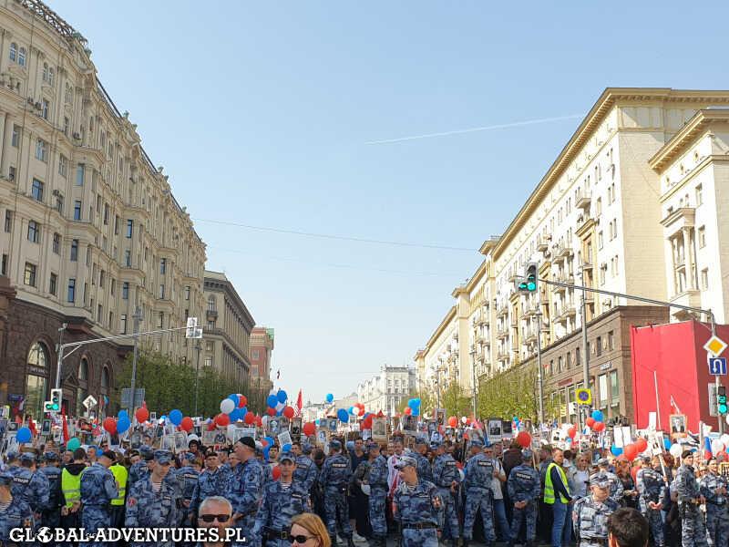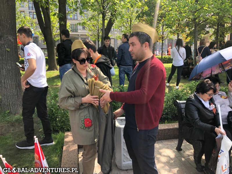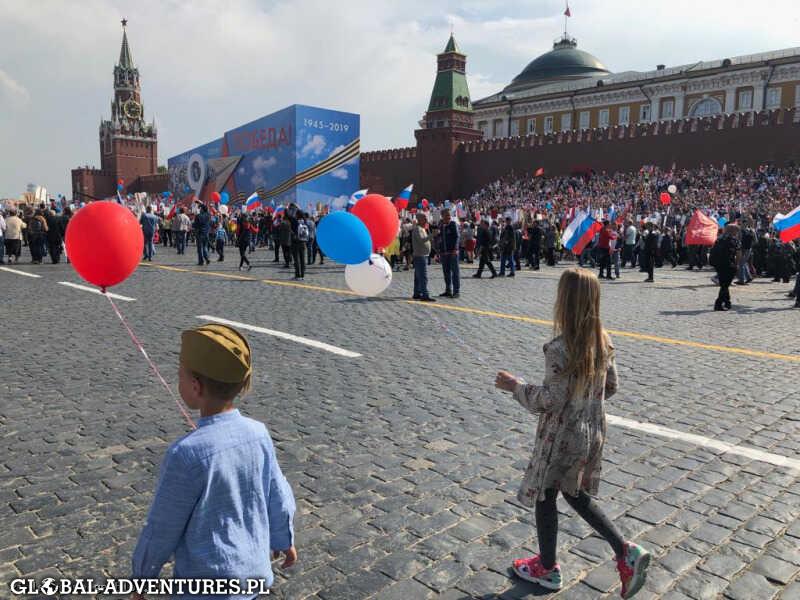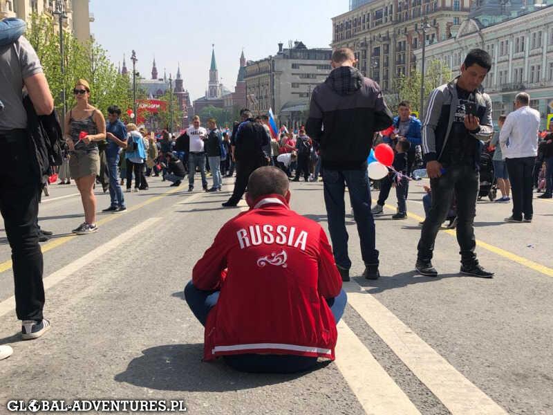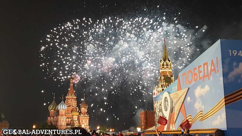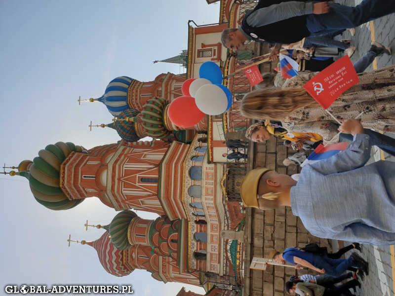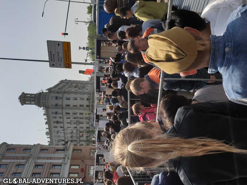 Wychodzimy z hotelu ok. 12 a tutaj wszystko zablokowane barierkami. Musimy iść boczkiem i udaje nam się wyjść na ulice gdzie będzie parada. Ludzi bardzo dużo.. są darmowe balony, woda i kasza : ) Przechodzimy w paradzie przez Plac Czerwony, atmosfera jest super, organizacja tez. Obiad przy rzece Moskwa i spacerkiem powrót ok. 19.30 do hotelu, chwila organizacji i idziemy jeszcze raz na plac czerwony ok. 15 minut na pokaz sztucznych ogni który zaczyna się o 22. O północy wracamy. Dziś po samym centrum przeszliśmy 14 km.