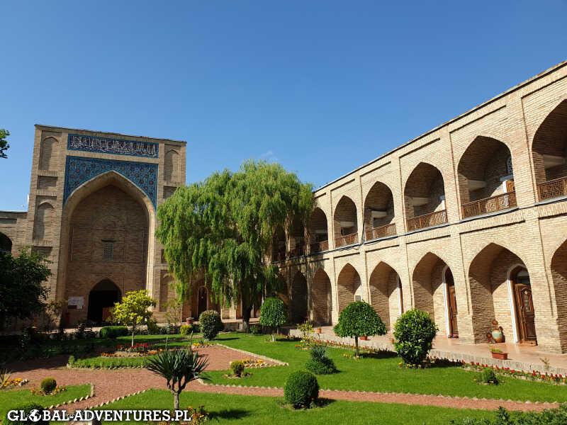 Madrasah Ulugh Beg, zbudowany przez Ulugh Beg podczas ery Timurid Empire w Timur – Tamerlane, ma imponujący iwan z pishtaq łukiem lancetowym lub portalem skierowanym w stronę placu. Narożniki są otoczone wysokimi minaretami. Panel mozaiki nad łukiem wejściowym iwan zdobią stylizowane ornamenty geometryczne. Kwadratowy dziedziniec obejmuje meczet i sale wykładowe, a otoczone są przez komórki sypialne, w których mieszkali uczniowie. Wzdłuż osi znajdują się głębokie galerie. Pierwotnie Ulugh Beg Madrasah był dwupiętrowy budynek z czterema kopułami darskhonas (sale wykładowe) w rogach.