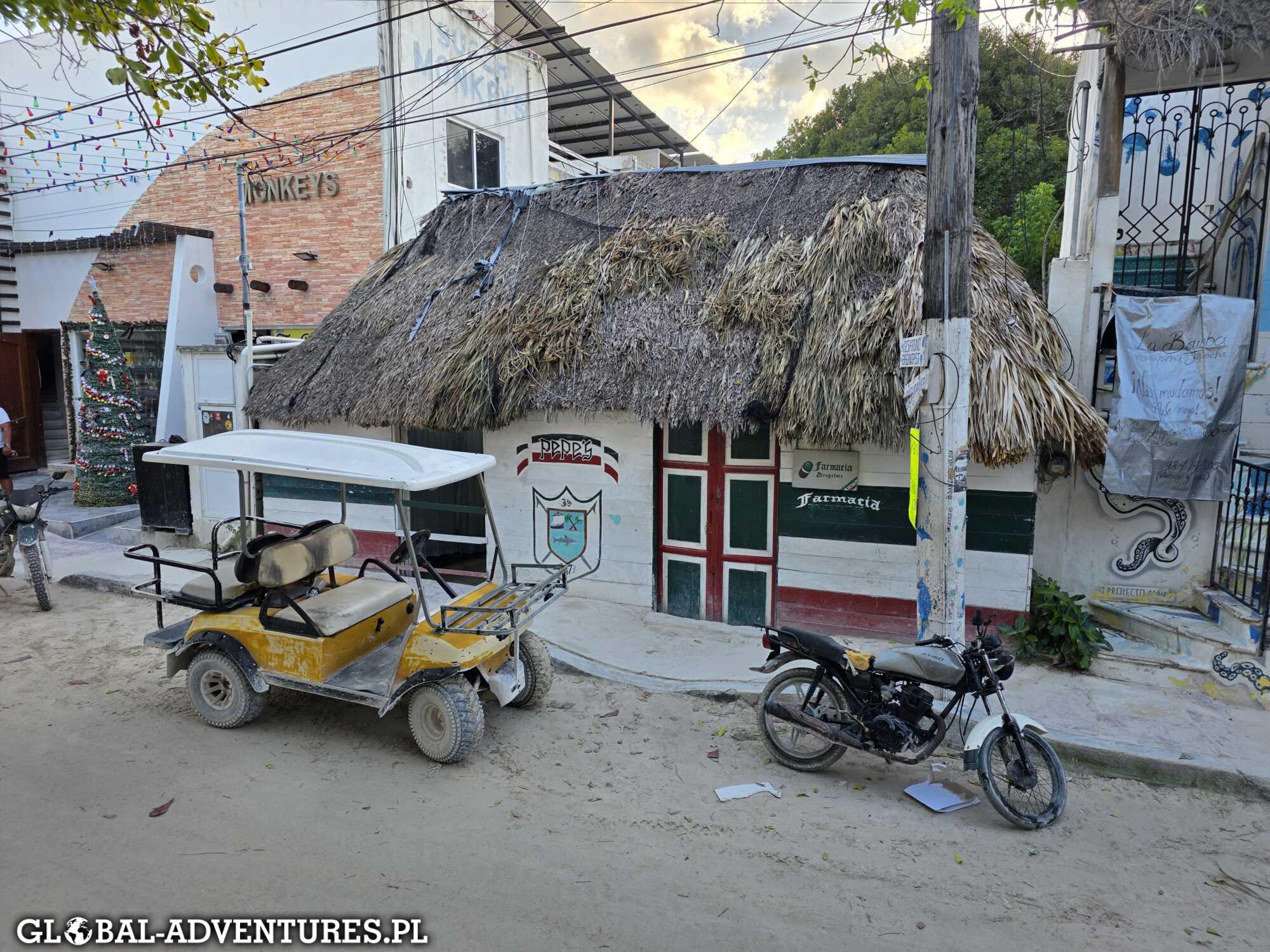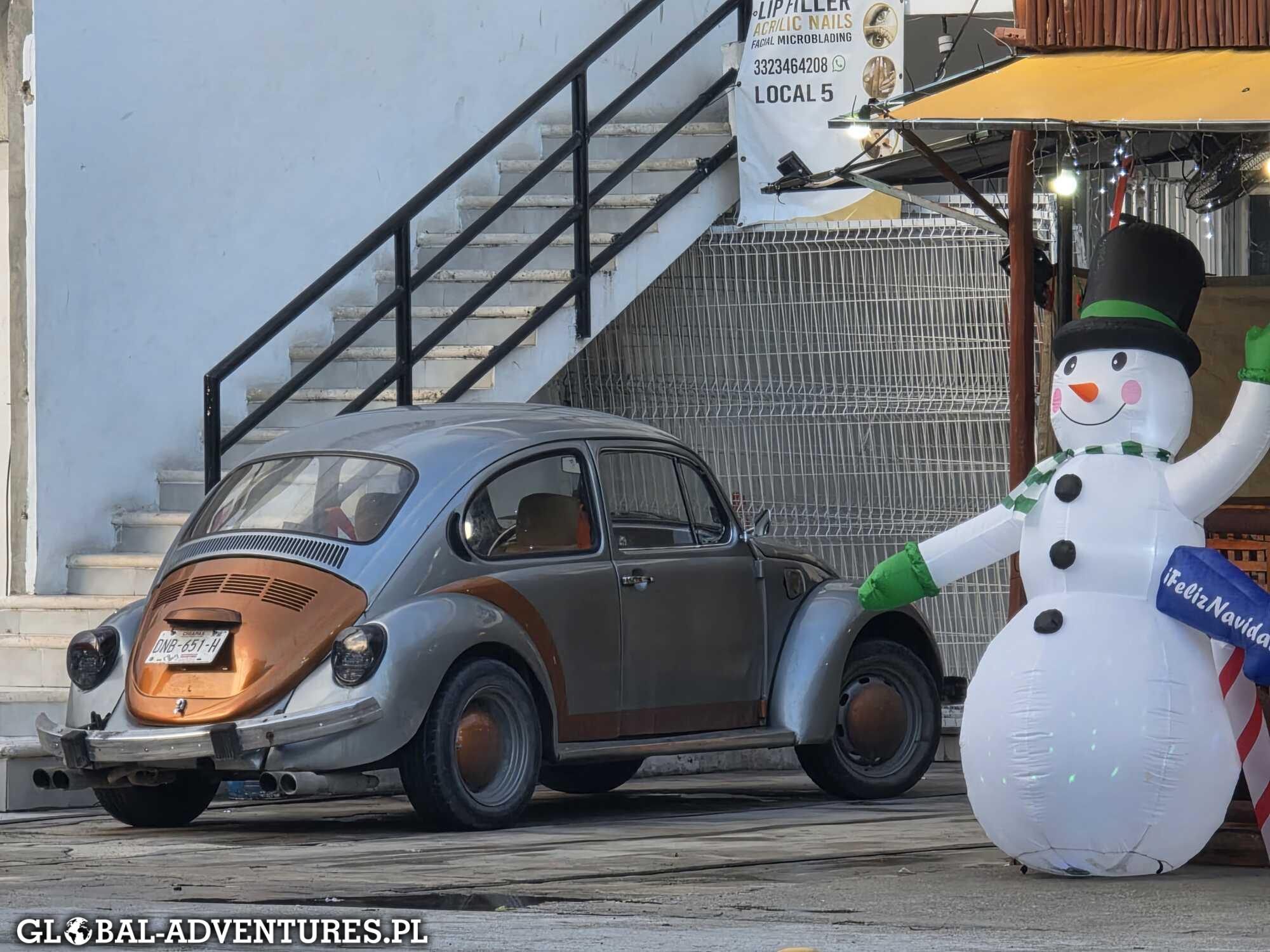 Jeździmy od zachodu do wschodu, i ze wschodu na zachód przecinamy piaskowe uliczki, zaglądamy tam, gdzie da się dojechać. W sumie robimy prawie 30 kilometrów po Holbox. Zatrzymujemy się w różnych fajnych miejscach, mamy lunch na plaży, zero pośpiechu. Dzieci oczywiście też swoje — raz jedno, raz drugie prowadzi auto. Pełen gaz, slalom między pieszymi i innymi wózkami. Idealny kurs na przyszłe prawo jazdy 😄 Holbox to jedyne miejsce, gdzie to w ogóle brzmi normalnie. Wieczorem oddajemy auto: zero problemów, dowód oddany i robimy jeszcze świąteczny spacer po wyspie. Spokojnie, bez planu, w tym holboxowym tempie. Bardzo udany dzień.