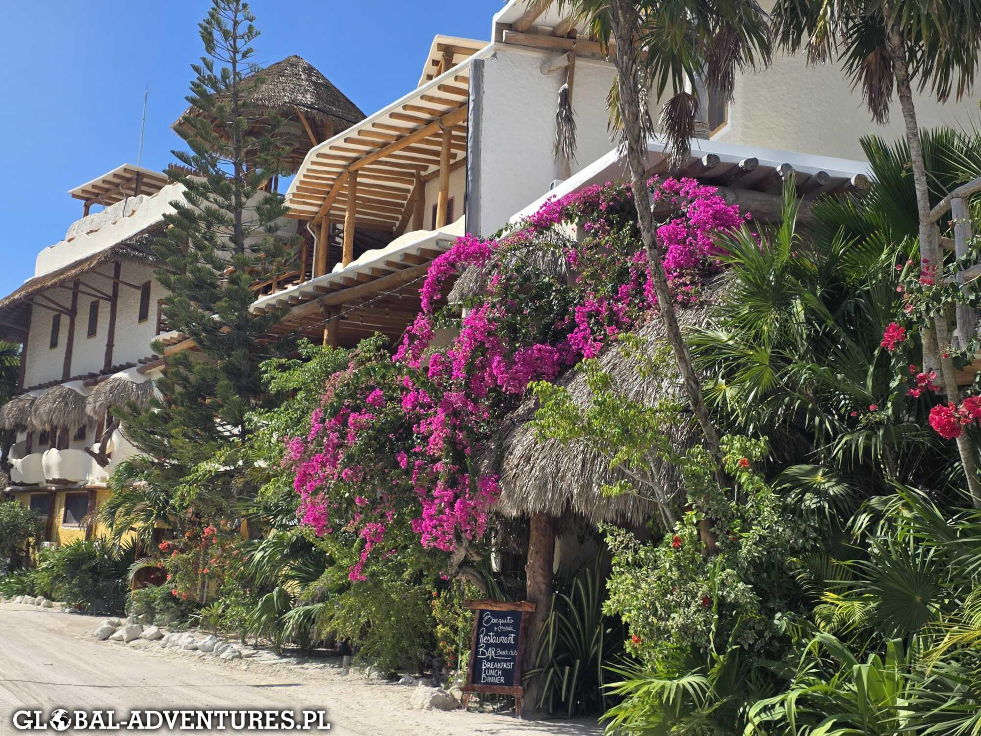 Bilety na prom bierzemy od razu w dwie strony. W jedną stronę kosztuje 330 peso, w dwie 600 peso, więc nie ma się nad czym zastanawiać. Po dopłynięciu jedziemy prosto do hotelu. Około 14:30 jesteśmy już przy naszym hotelu. Nowe miejsce, nowy klimat i zupełnie inne tempo. Holbox od pierwszych minut daje poczucie, że tu nigdzie nie trzeba się spieszyć. Hotel mamy praktycznie w samym centrum wyspy Holbox, ale bez miejskiego zgiełku. Hotel jest mega klimatyczny, w stylu boho, dopieszczony w każdym detalu. Czuć, że ktoś naprawdę miał na to pomysł. Mamy do dyspozycji dwa piętra. Na dole zostają dzieci, na górze my. Każdy ma swoją przestrzeń, a całość jest bardzo przytulna i spokojna. Od pierwszej chwili czujemy się tu po prostu dobrze.