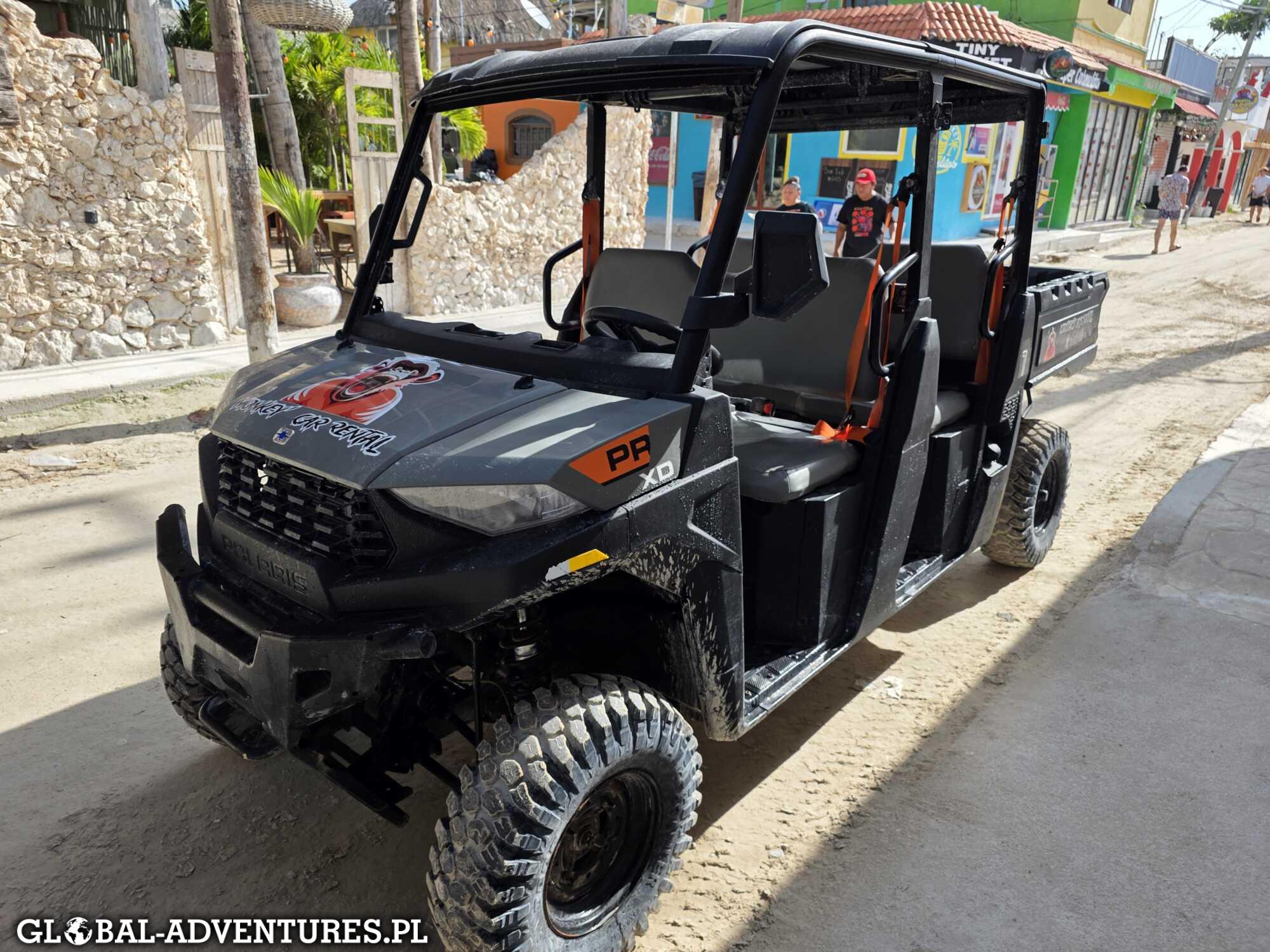 Cel: ten klasyczny mix wózka golfowego z quadem, którym tu wszyscy jeżdżą. Szybko okazuje się, że temat nie jest prosty — wszystko zajęte, brak aut, zero opcji. Trafiamy do jednej wypożyczalni, pani mówi wprost: dziś nie ma szans na żadne auto. Dobra. Idziemy spokojnie na śniadanie i po nim próbujemy jeszcze raz. Znowu to samo — nie ma aut.