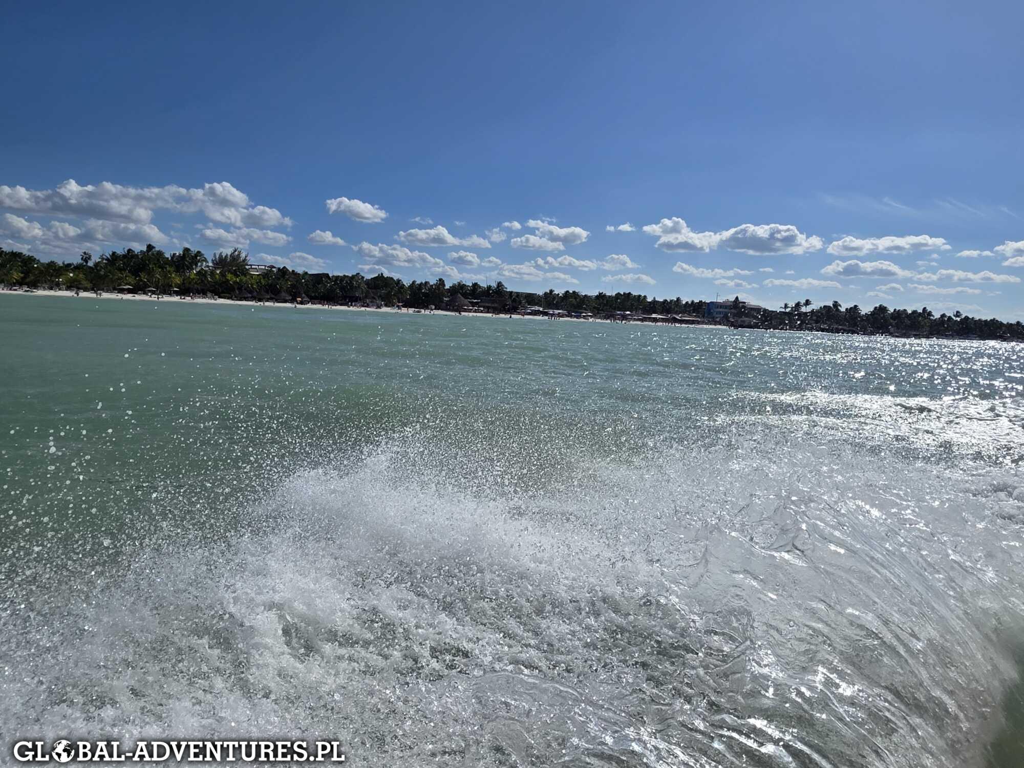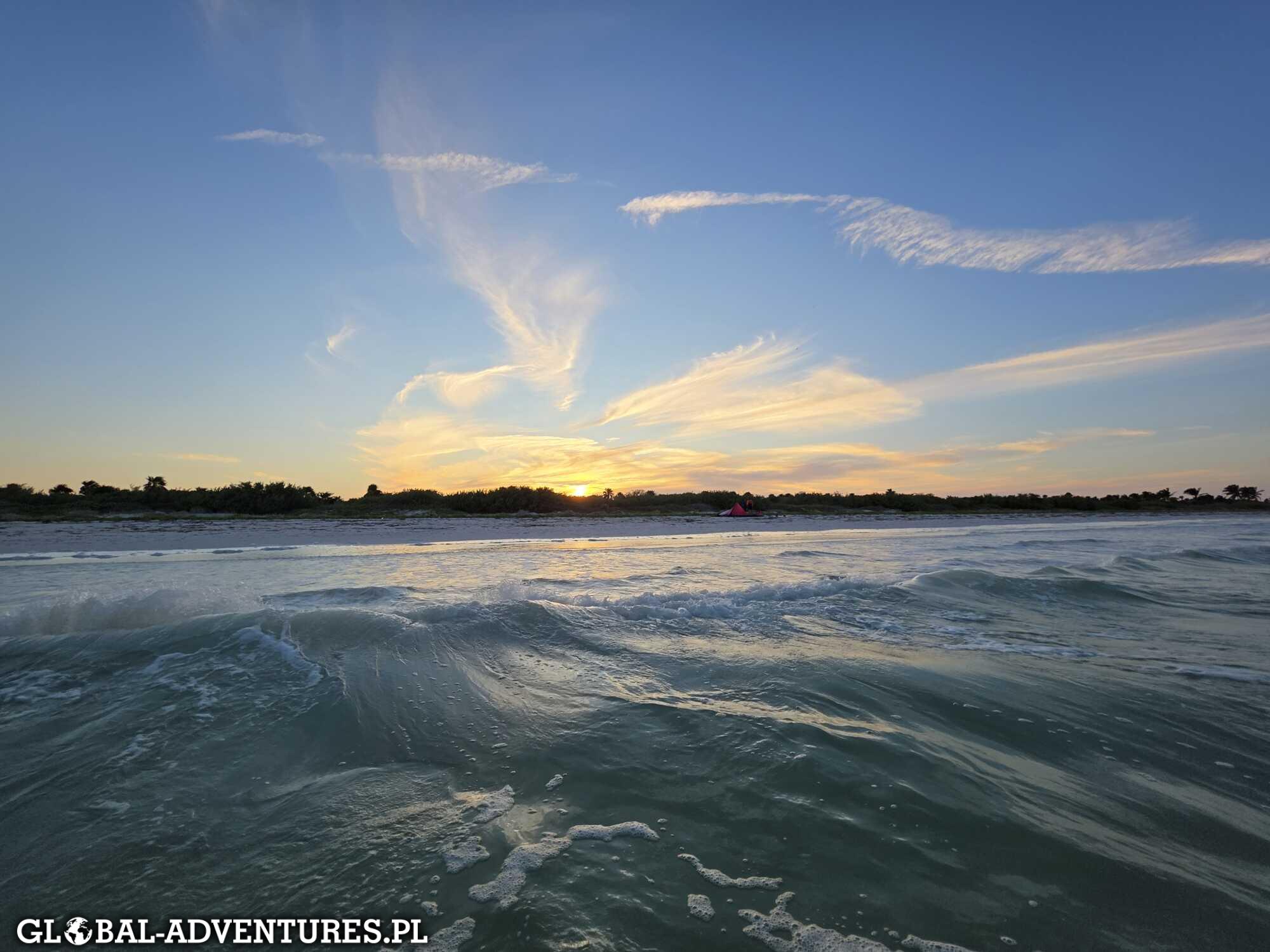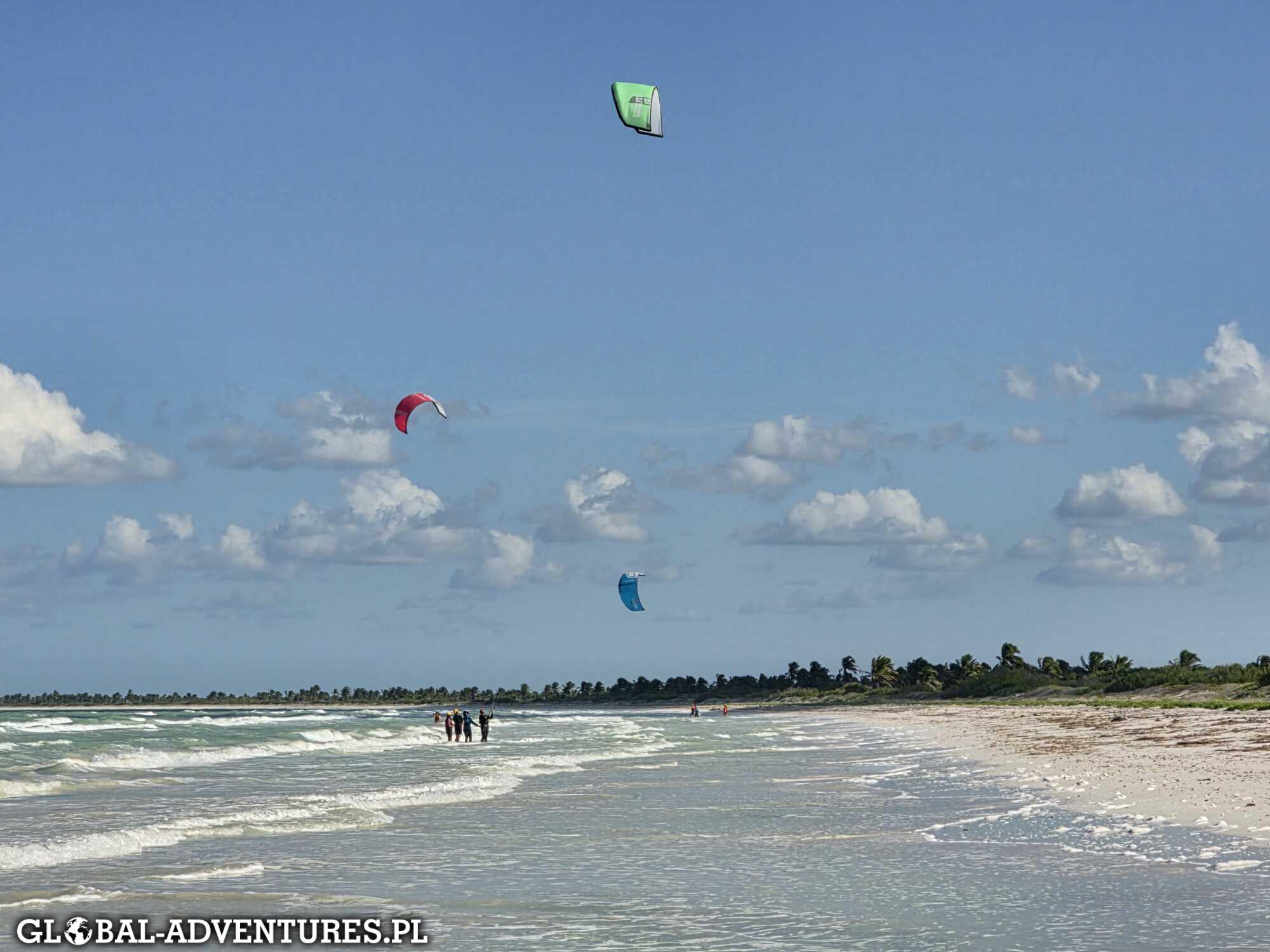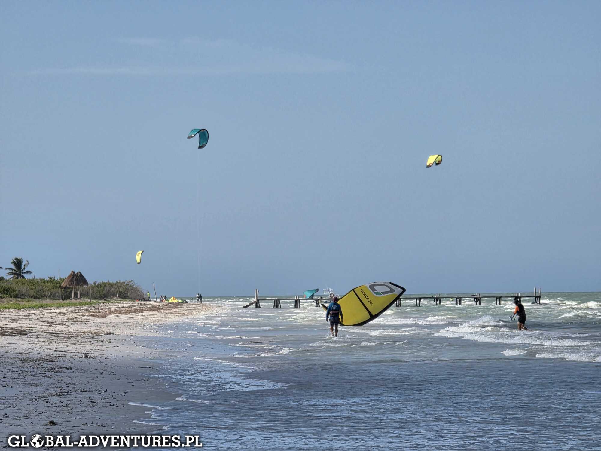 Około 8:15 meldujemy się na spocie i zaczynamy pierwszy dzień kitesurfingu na wyspie Holbox. Woda jest świetna, a kolory dosłownie nieziemskie. Turkus, błękit, jasny piasek — wszystko wygląda jak z pocztówki. Wiatr jest dość zwariowany. Raz słabszy, raz mocniejszy, zmienny. Ten dzień traktujemy głównie jako przypomnienie i poukładanie podstaw tego, czego już się nauczyliśmy. Bez ciśnienia. Trzy godziny na wodzie mijają bardzo szybko.