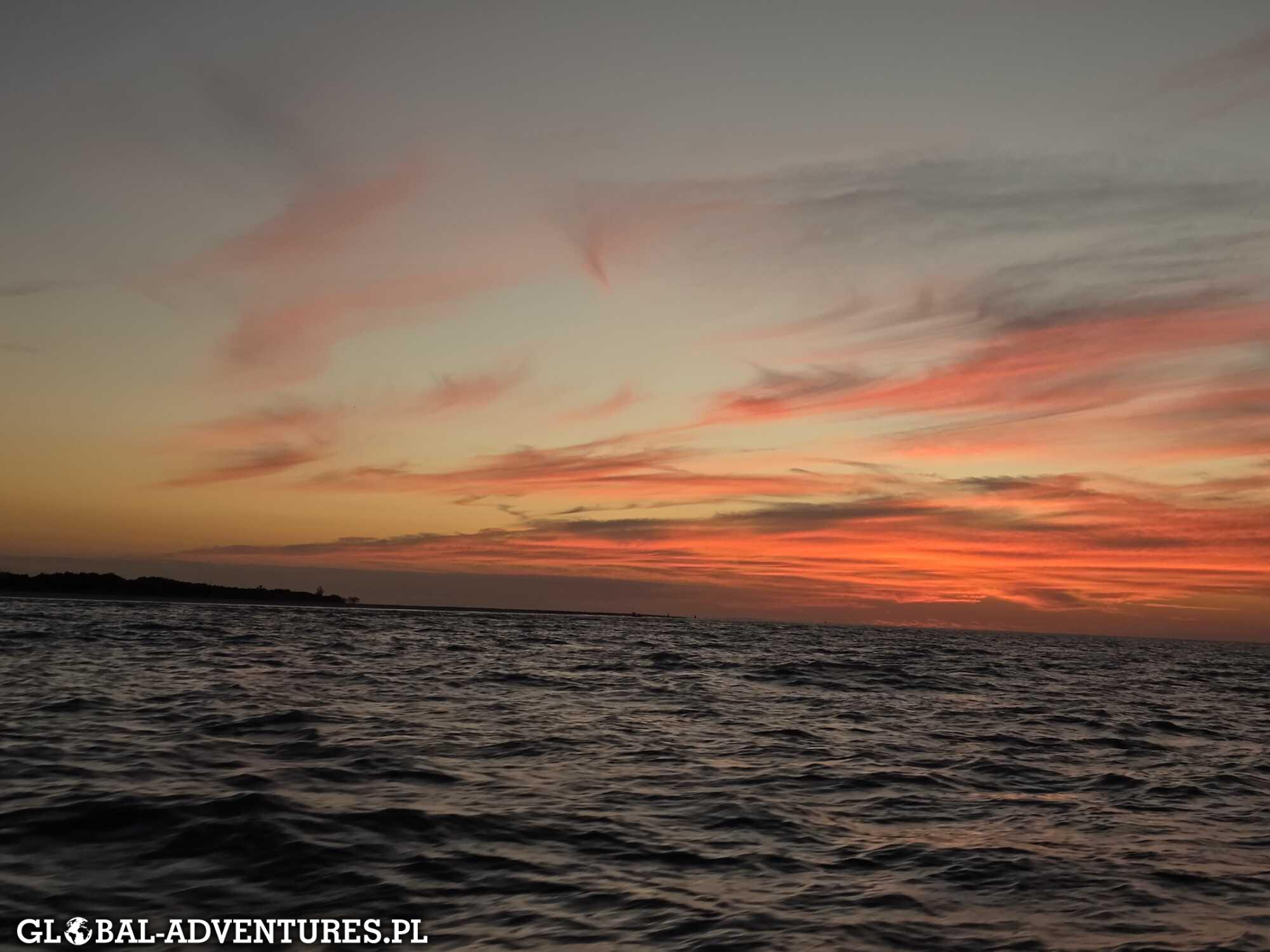 Około 14:15 mamy zbiórkę i ruszamy łódką na zupełnie inny kitesurfingowy spot — Mosquito Point. To miejsce jest po zachodniej stronie wyspy na terenie parku narodowego. Da się tam dotrzeć tylko łódką — nie ma żadnych dróg ani ścieżek. Na miejscu warunki zupełnie inne niż wcześniej. Wiatr super stabilny i równy, dokładnie taki, jakiego potrzebujemy. Za to fale są spore, więc łatwo nie jest. Ale dziś się nie poddajemy. Pływamy, próbujemy, walczymy przez ponad trzy godziny. I w końcu… przełamujemy się. Przekraczamy nasz Rubikon — linię, której do tej pory nie byliśmy w stanie pokonać. Wchodzi kolejny skill, kolejny etap na naszej drodze do bycia coraz lepszym kitesurferem.