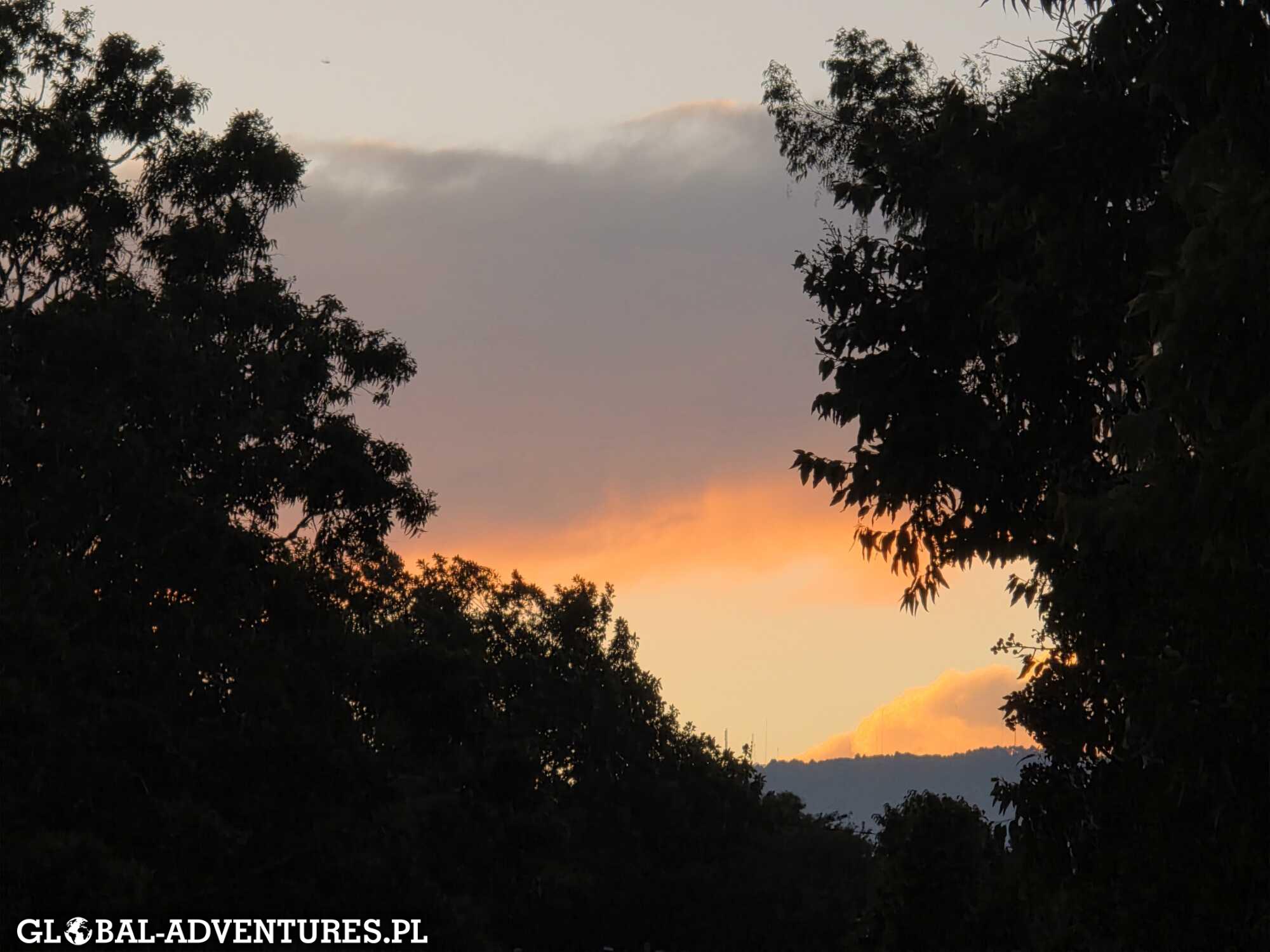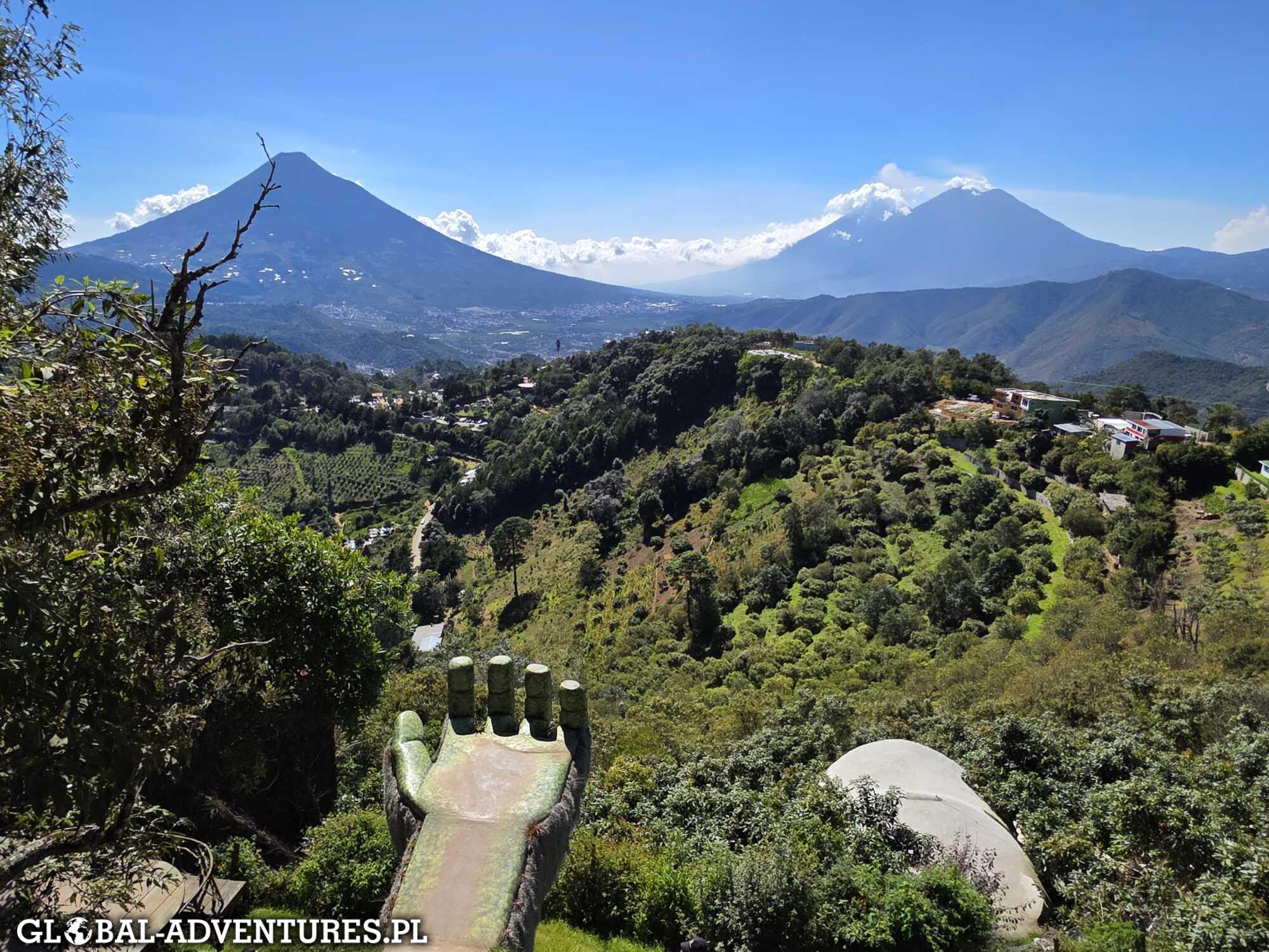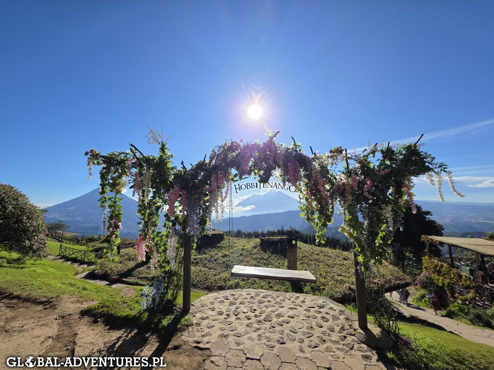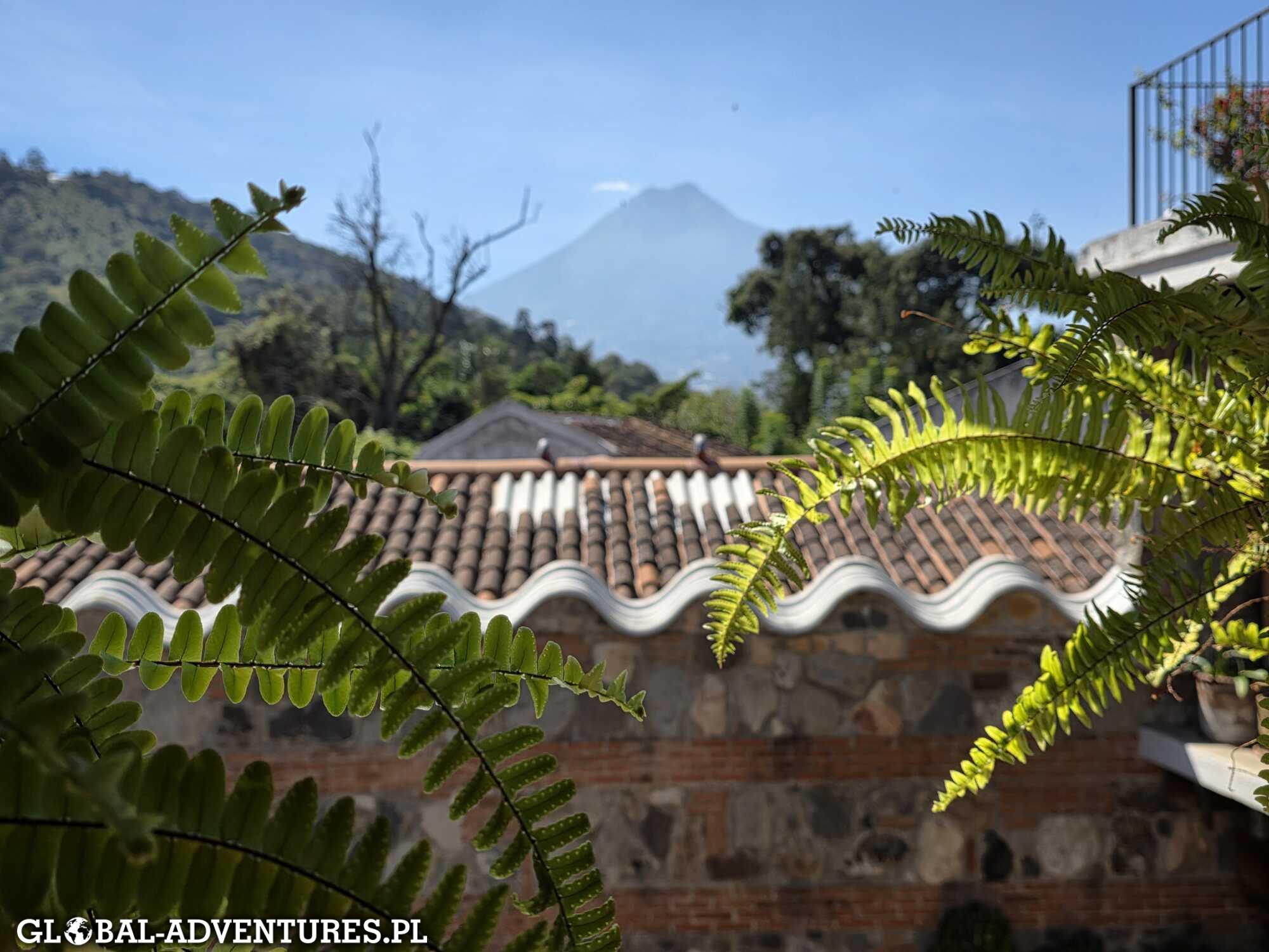 Wychodzimy z pokoju i patrzymy przez zieleń na otaczające nas wulkany. Cisza, lekkie światło, wszystko spokojne. Robi to ogromne wrażenie. Śniadanie jemy bez pośpiechu. Około 11:00 ruszamy do miasta. Trochę spaceru, kawa po drodze, a potem wsiadamy w autobus i jedziemy do Hobbitenango. To taki park, gdzie można pochodzić, usiąść, odpocząć. Są różne proste atrakcje, ale najważniejsze są widoki — z kilku miejsc widać cztery wulkany naraz. Spędzamy tam około czterech godzin. Wracamy do Antigui około 17:30. Spacerujemy uliczkami starego miasta przy zachodzącym słońcu. Na koniec idziemy na kuchnię argentyńską — steki są całkiem niezłe. Około 22:00 wracamy do hotelu