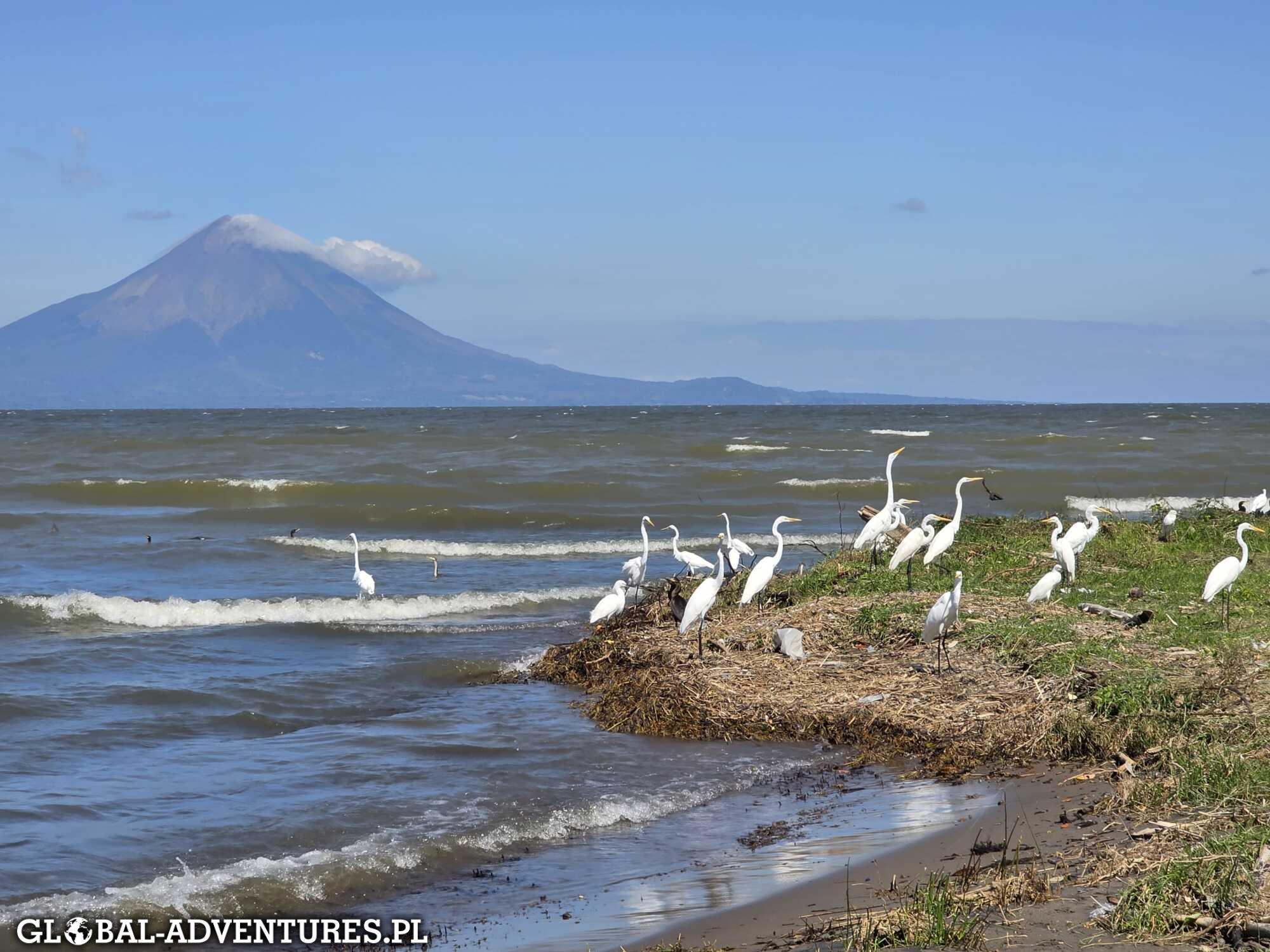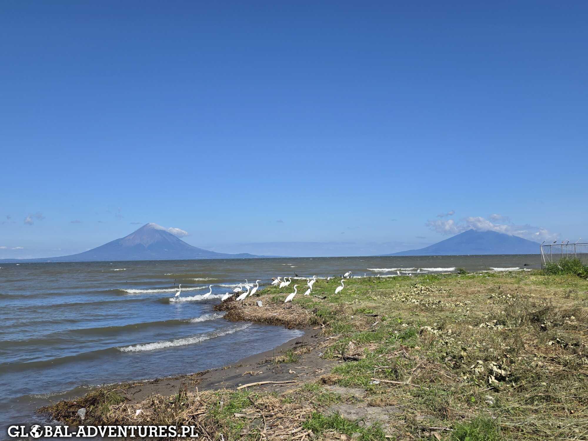 Zatrzymujemy się też nad jeziorem z widokiem na dwa idealne stożki wulkaniczne — Concepción Volcano i Maderas Volcano na wyspie Ometepe. Widok jest piekny.