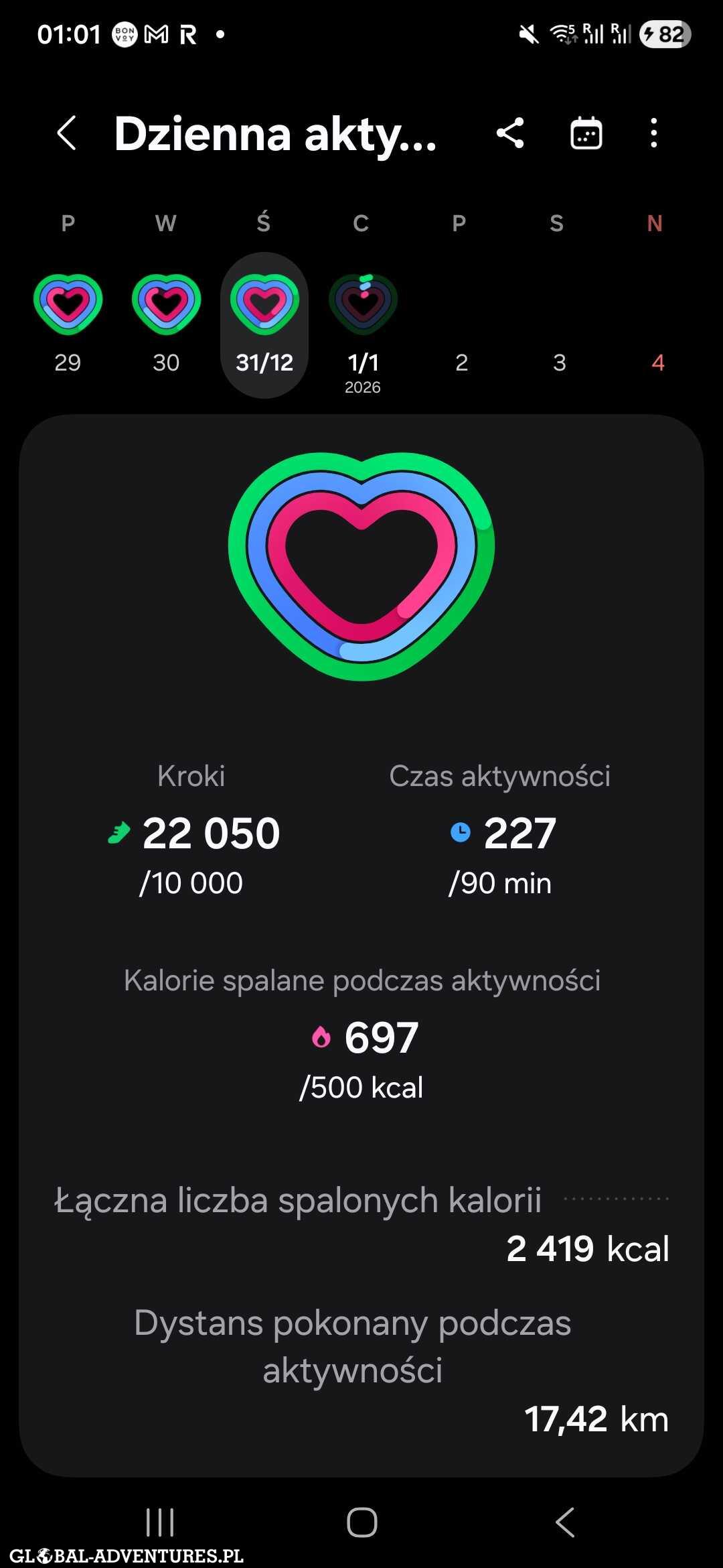 Wracamy na spacer po mieście w rejonie Zony 10 i Zony 9 i próbujemy znaleźć jakiekolwiek miejsce na kolację sylwestrową. Nie ma szans. Większość miejsc jest zamknięta albo właśnie się zamyka. W końcu, około 20:00, lądujemy znowu na koreańskim grillu I to uznajemy za naszą kolację noworoczną. Tego dnia robimy ponad 20 tysięcy kroków, czyli około 17,5 km pieszo.