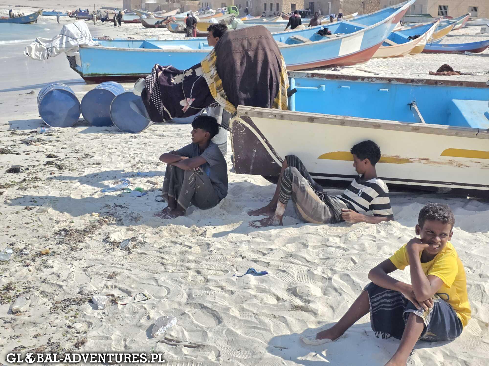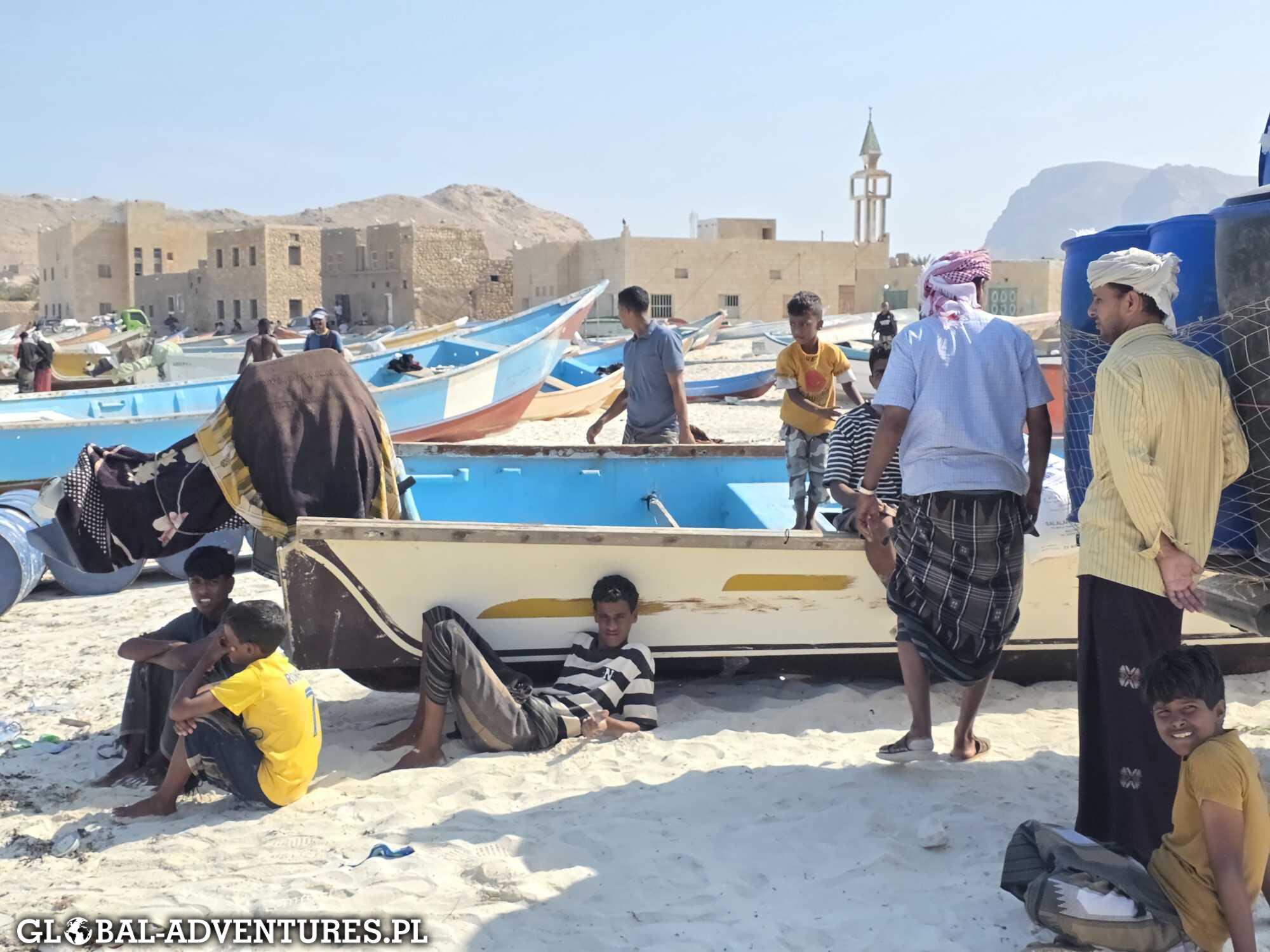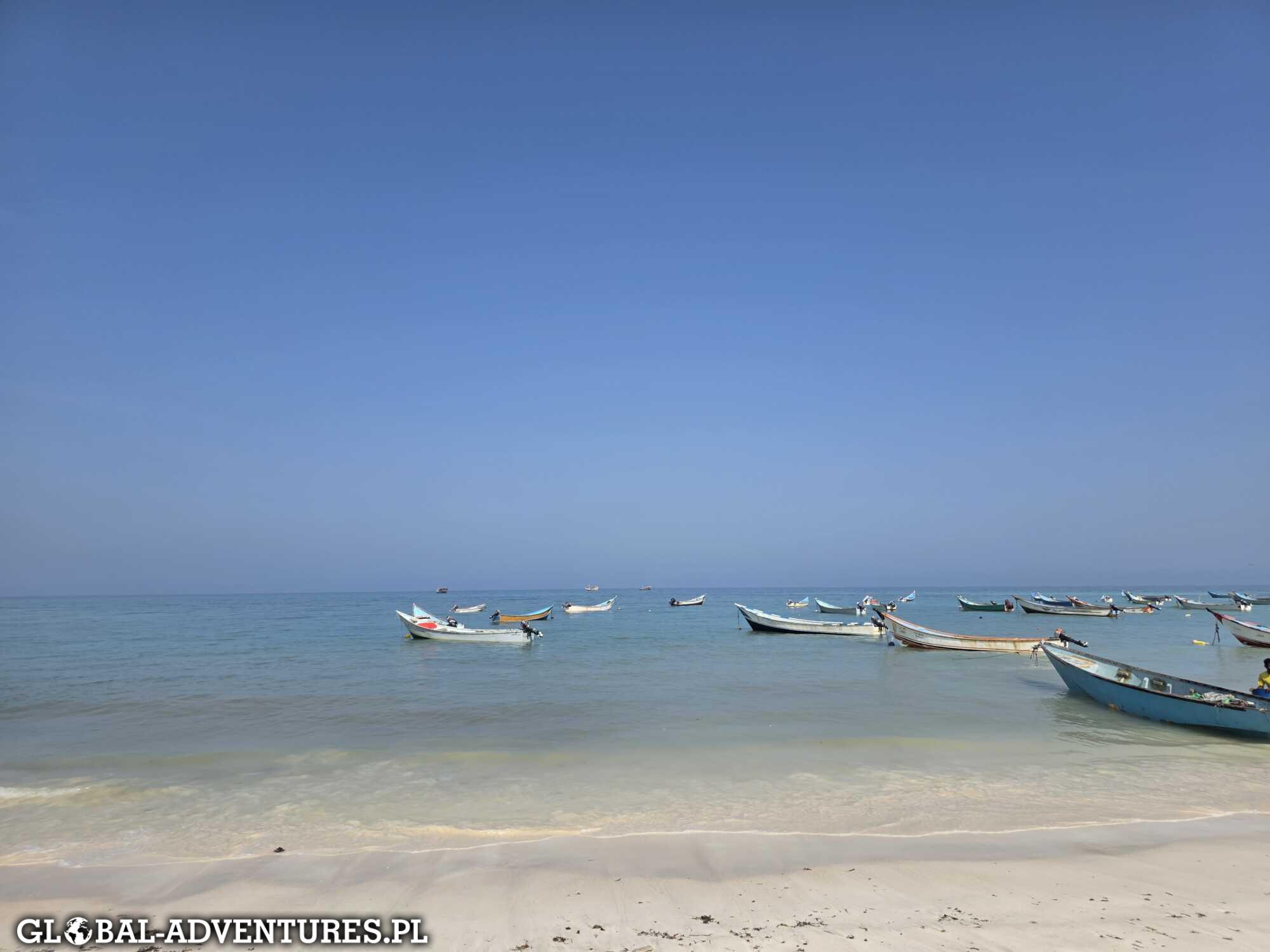 Tym razem ruszamy do miasta, gdzie wsiadamy na łódkę i wypływamy w kierunku Shoab – słynnej Złotej Plaży. Już sama droga morska jest niesamowita – mijamy potężne skały i błękitne zatoczki, a po drodze oglądamy delfiny wirujące, które towarzyszą naszej łodzi.