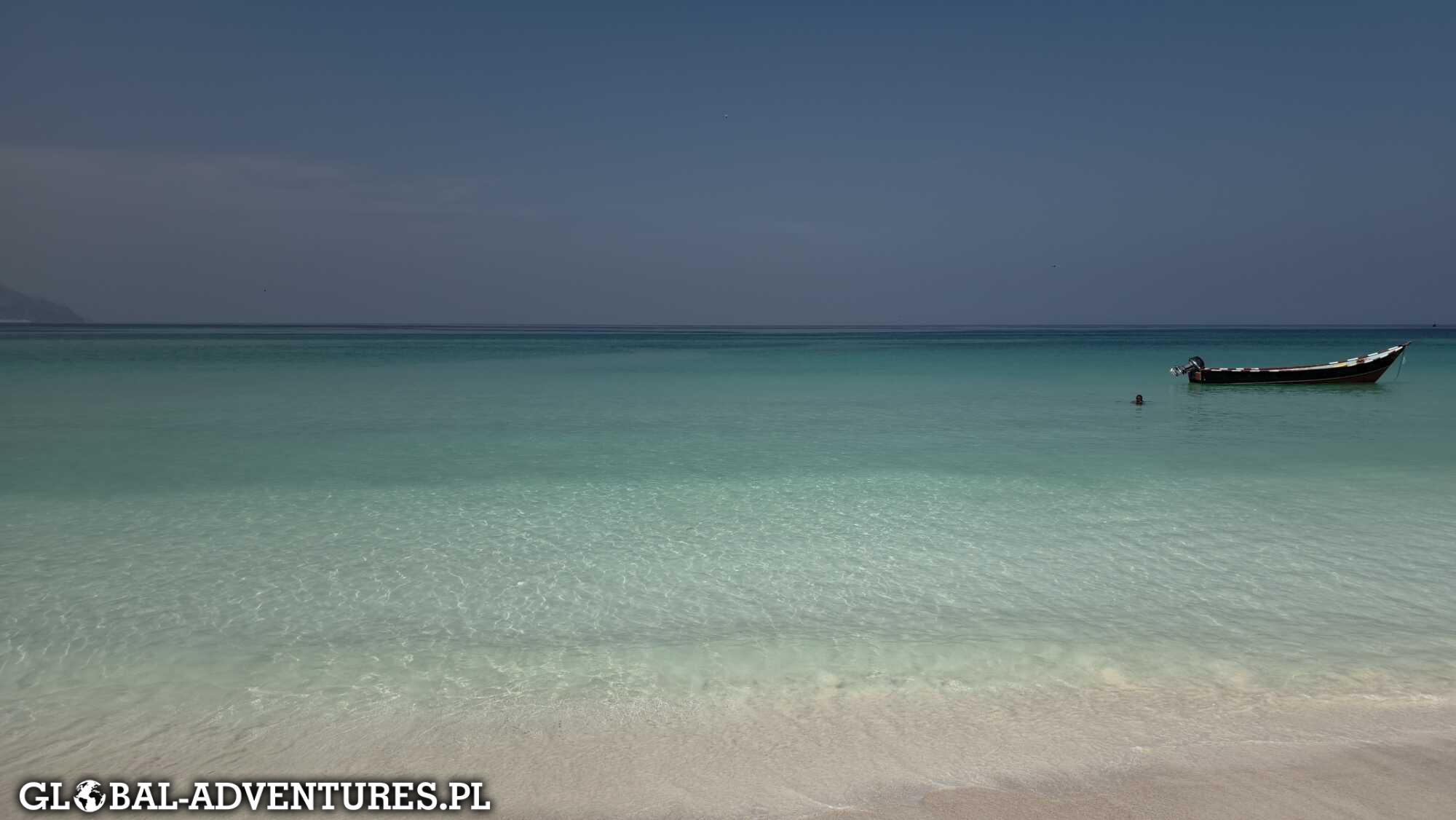 Na miejscu – bajka. Plaża Shoab to raj: biały, drobny piasek, a woda ma kolor zielonkawoniebieski, przejrzysta jak szkło. Spędzamy tam około dwóch godzin – kąpiel, relaks, cisza i nieziemskie widoki. Po plażowaniu wracamy łódką do naszego obozu przy Lagunie Detwah – kolejna godzina pełna wrażeń i morskiego wiatru.