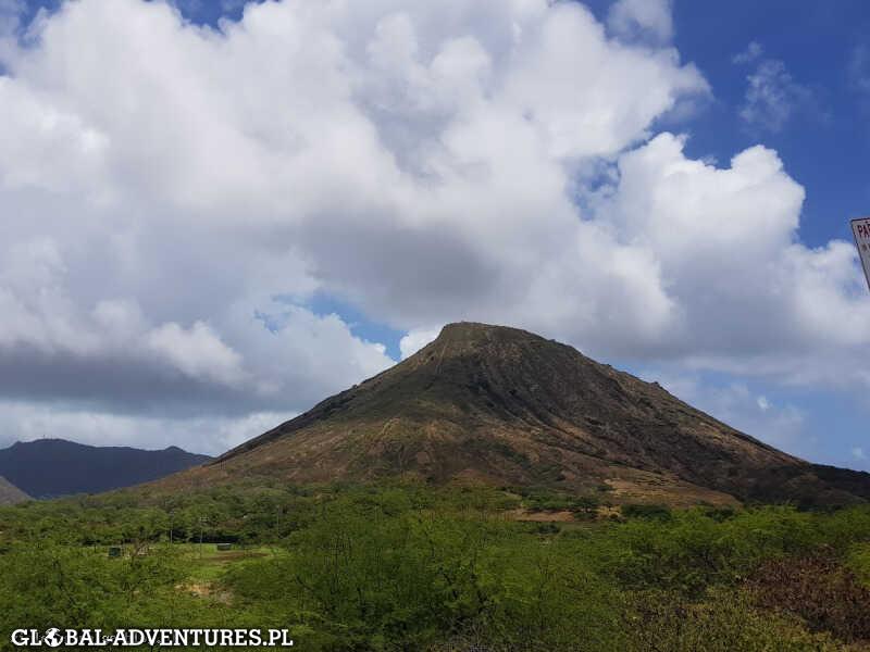 Z plaży rozciąga się widok na położony na wschodzie stożek wygasłego wulkanu Diamond Head.
