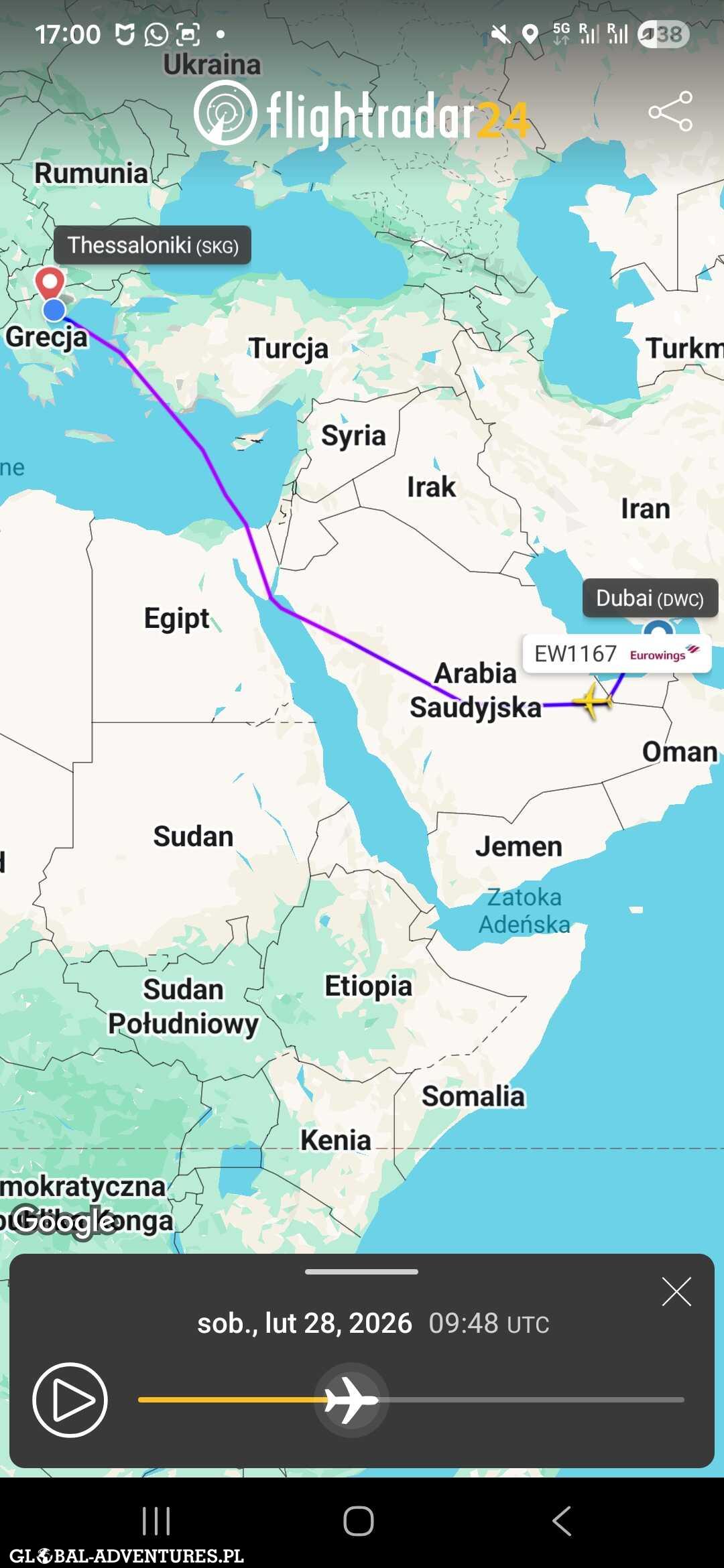 W międzyczasie zamknięta zostaje przestrzeń Bahrajnu i Kataru. Robimy kilka kółek w okolicy Emiratów, Bahrajnu i Kataru, w końcu dostajemy zgodę na przelot nad Arabią Saudyjską i Egiptem. Trasa się wydłuża, spalanie rośnie, więc po 7 godzinach lotu lądujemy w Thessaloniki w Grecji na tankowanie. Postój krótki, około 30 minut. Potem wylot do Berlina.